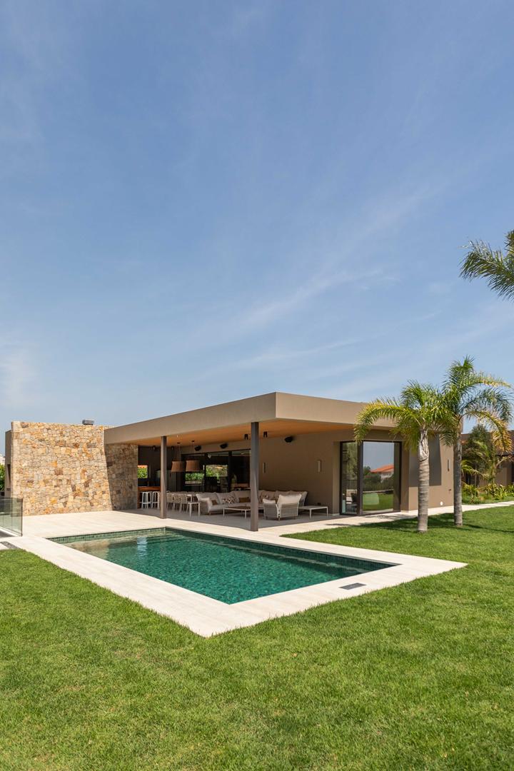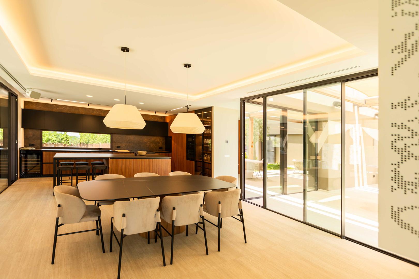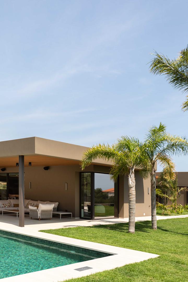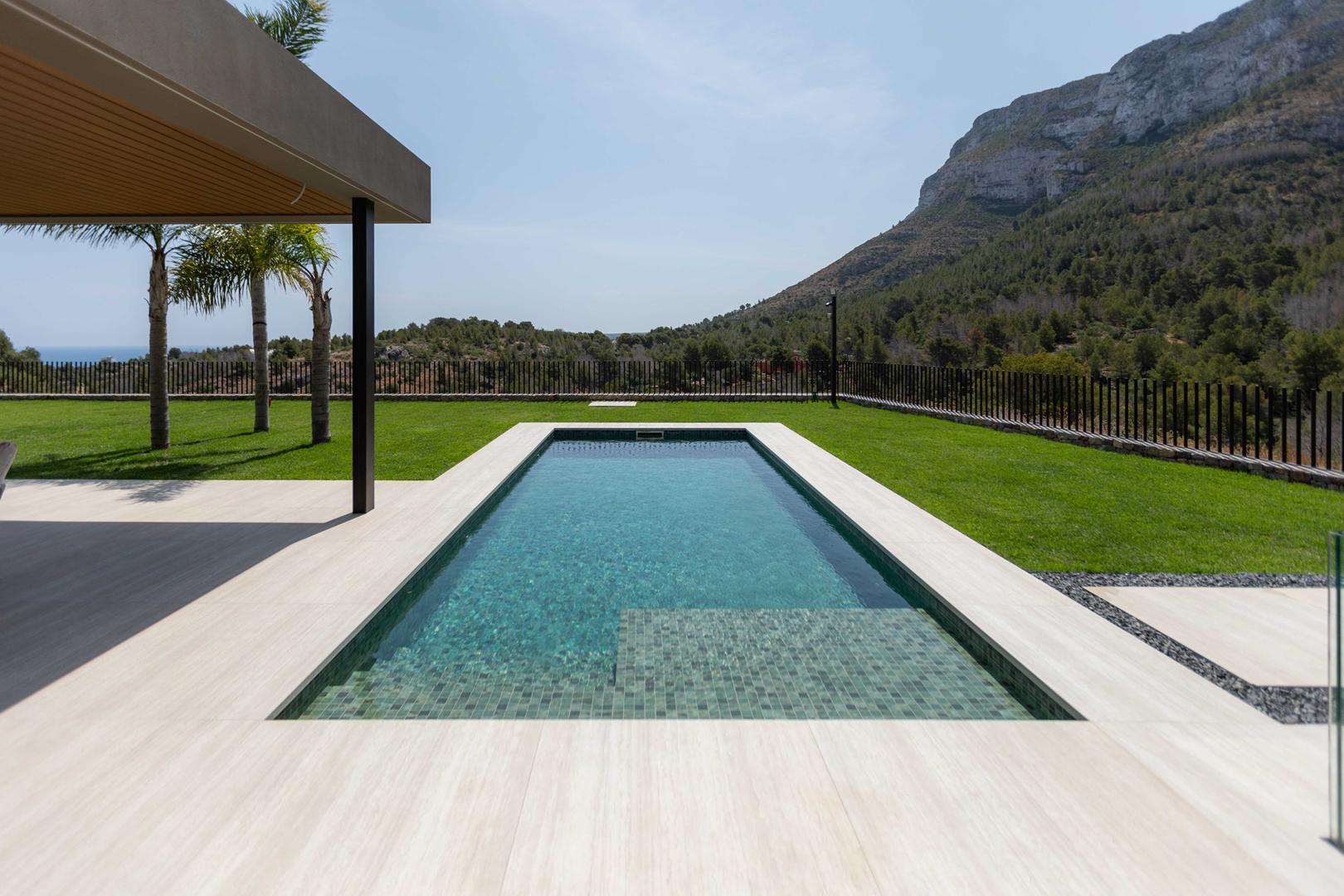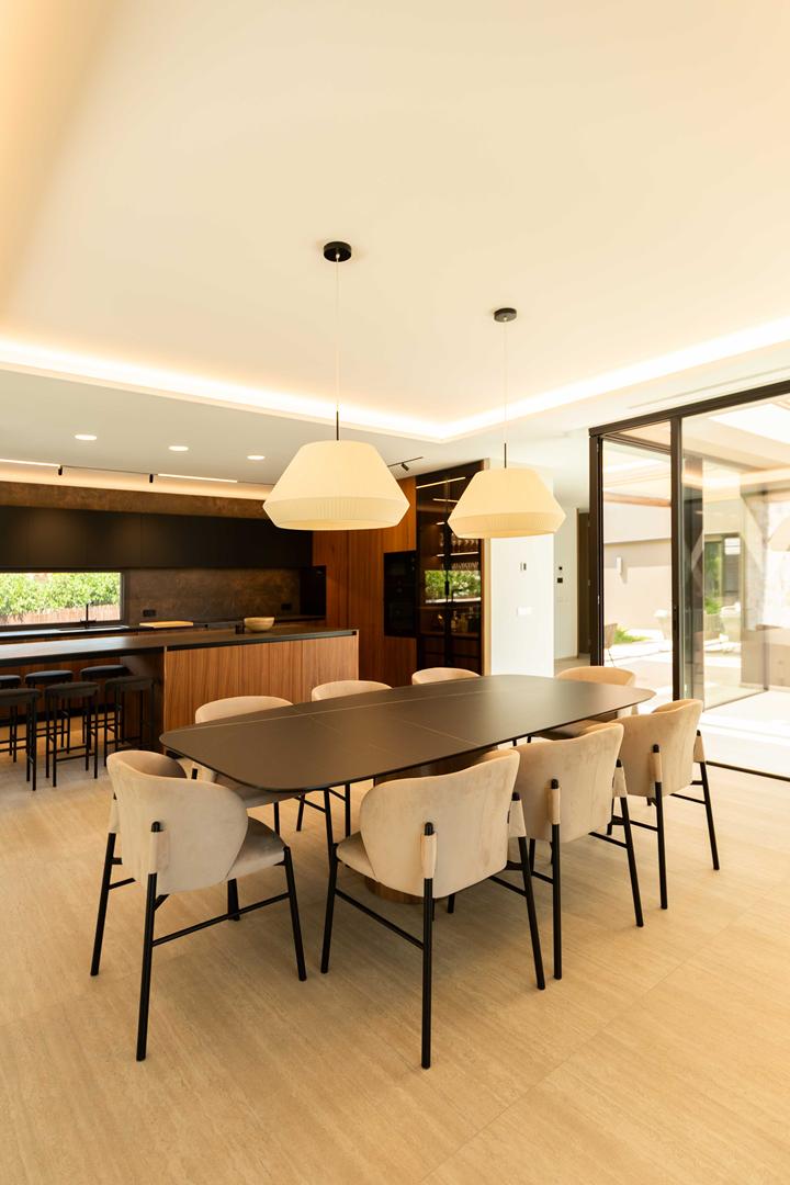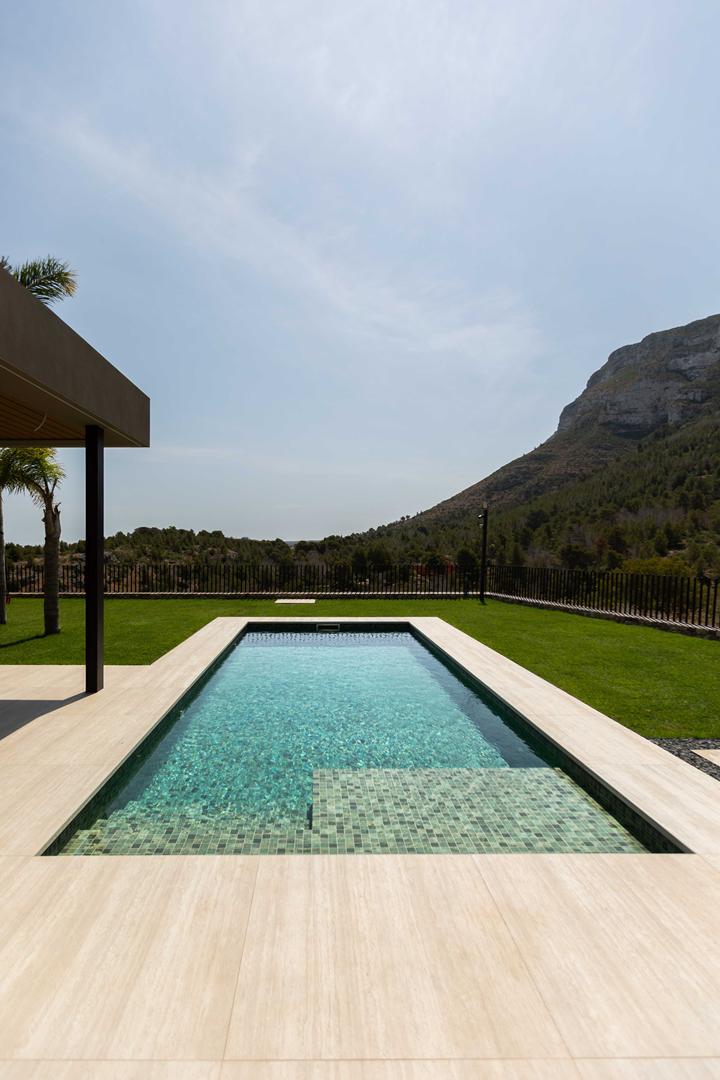 La instalación de la carpintería de gran formato fue crucial, especialmente en la ventana con apertura en esquina que accede al patio interior, requiriendo una alta precisión para asegurar la hermeticidad y el correcto funcionamiento del sistema. En el exterior, se construyó una piscina de diseño minimalista con revestimiento de gresite oscuro (o similar), logrando un contraste vibrante con el césped y los tonos neutros del pavimento de la terraza.