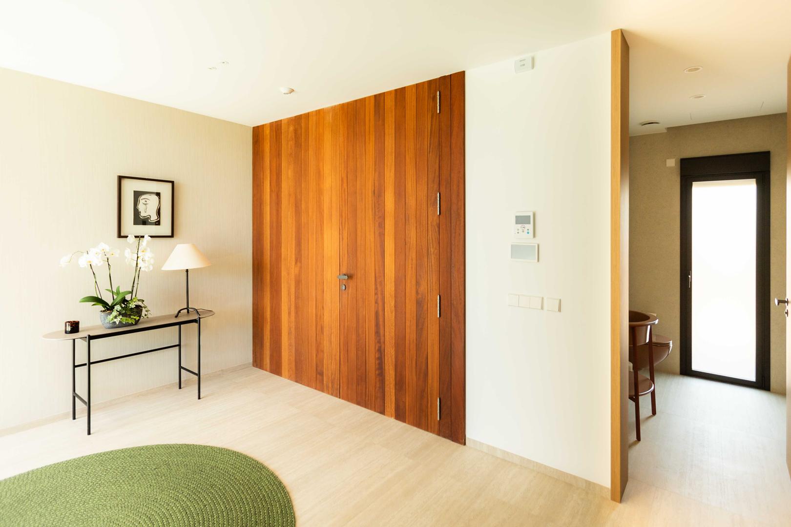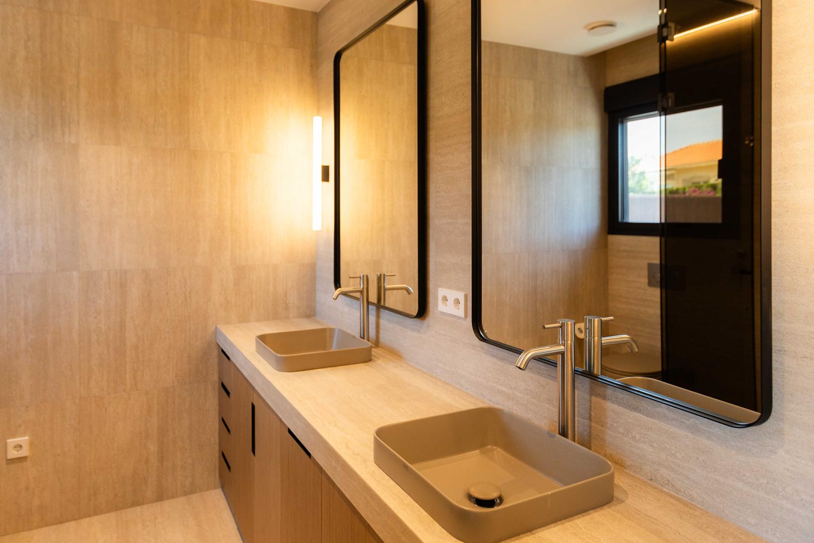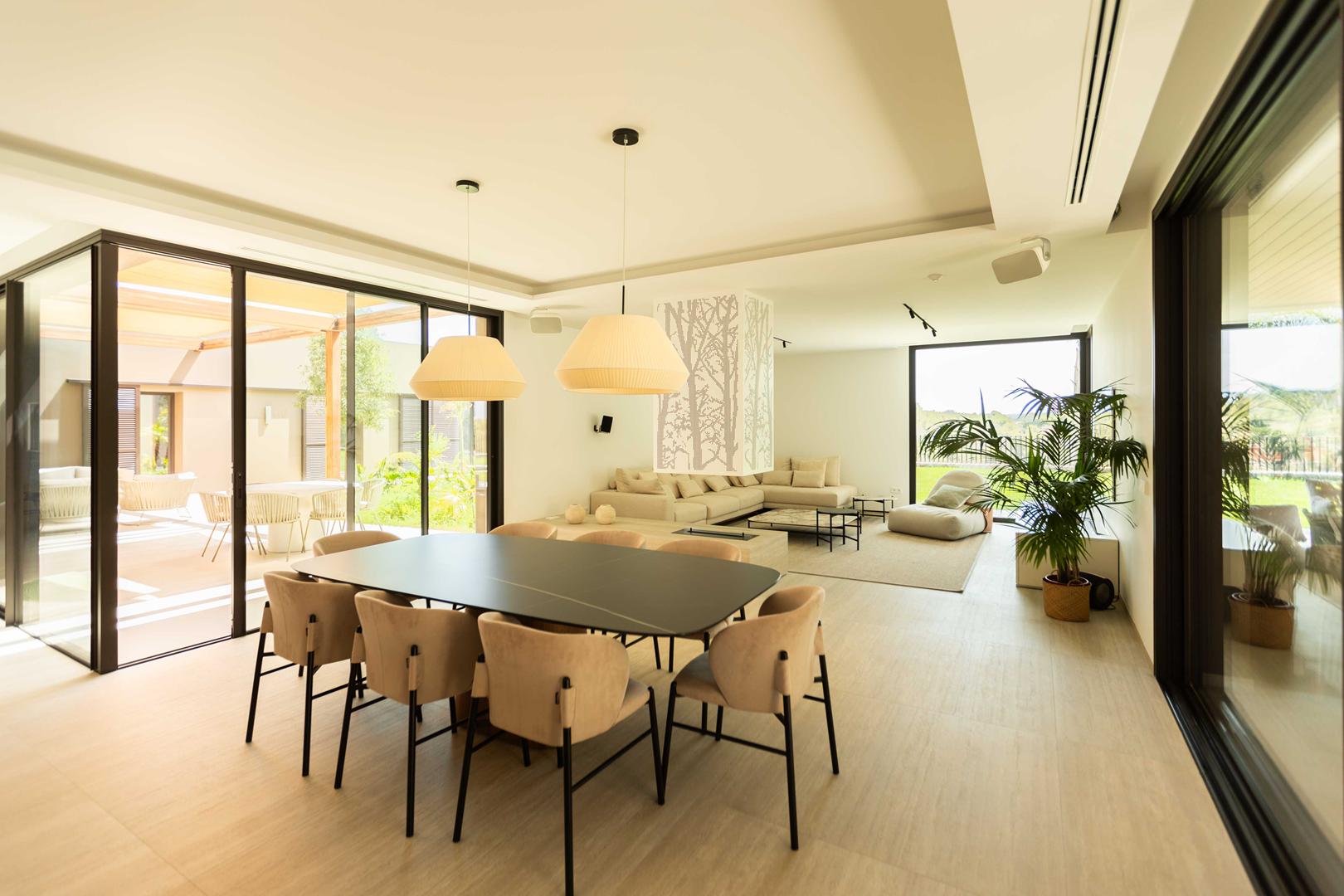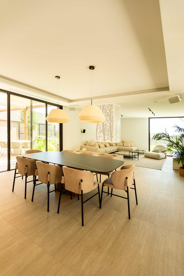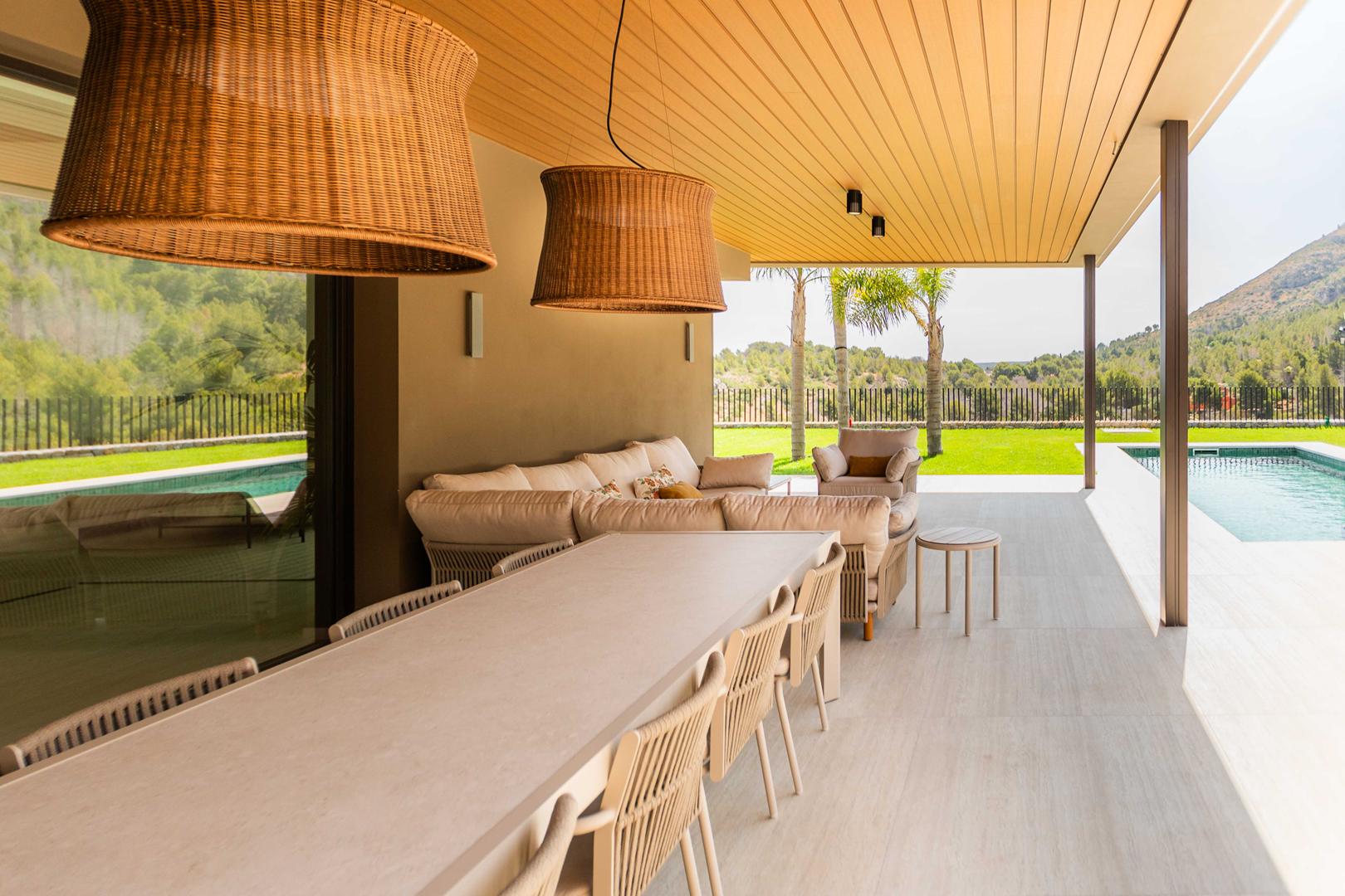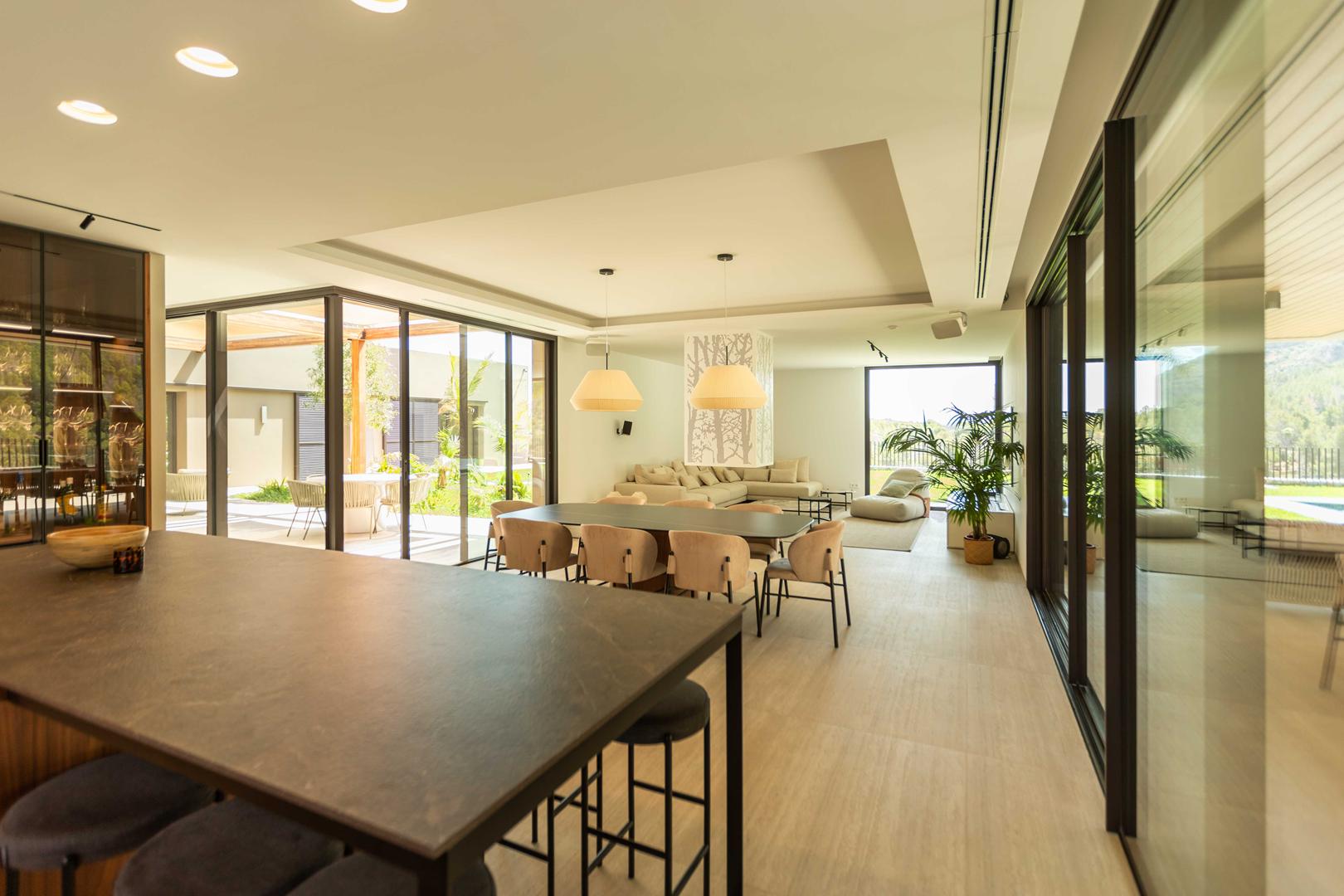 La instalación de la carpintería de gran formato fue crucial, especialmente en la ventana con apertura en esquina que accede al patio interior, requiriendo una alta precisión para asegurar la hermeticidad y el correcto funcionamiento del sistema. En el exterior, se construyó una piscina de diseño minimalista con revestimiento de gresite oscuro (o similar), logrando un contraste vibrante con el césped y los tonos neutros del pavimento de la terraza.