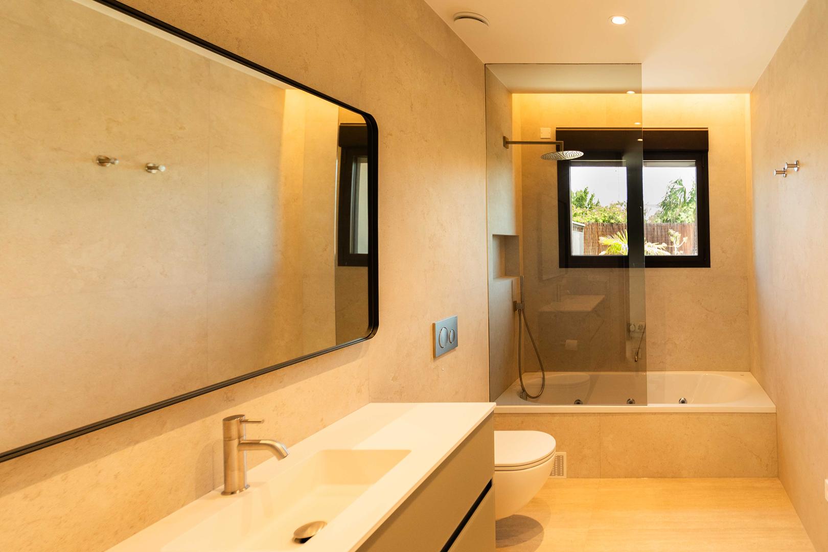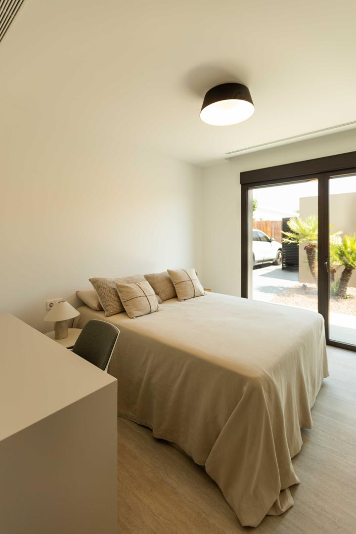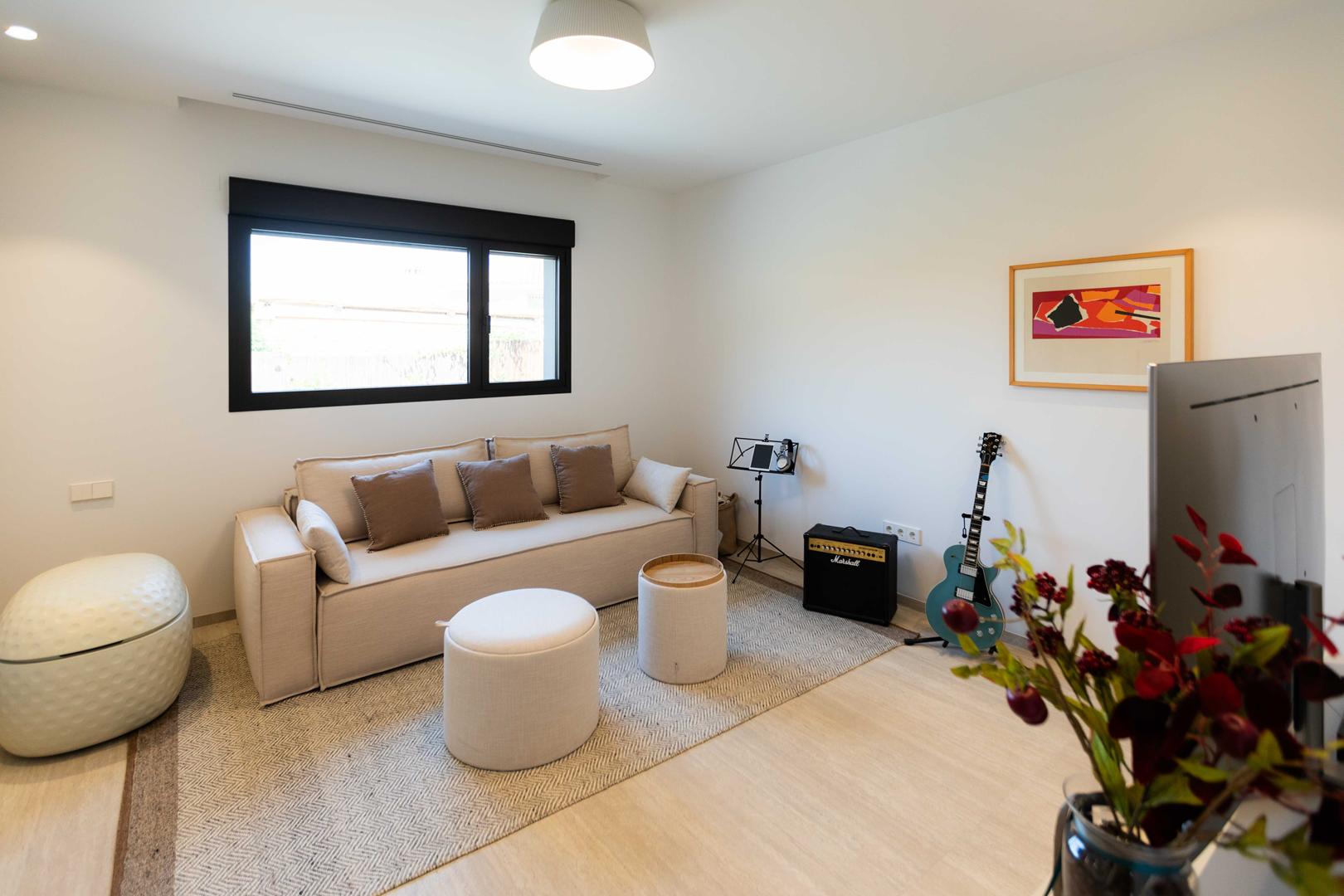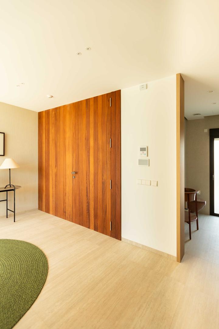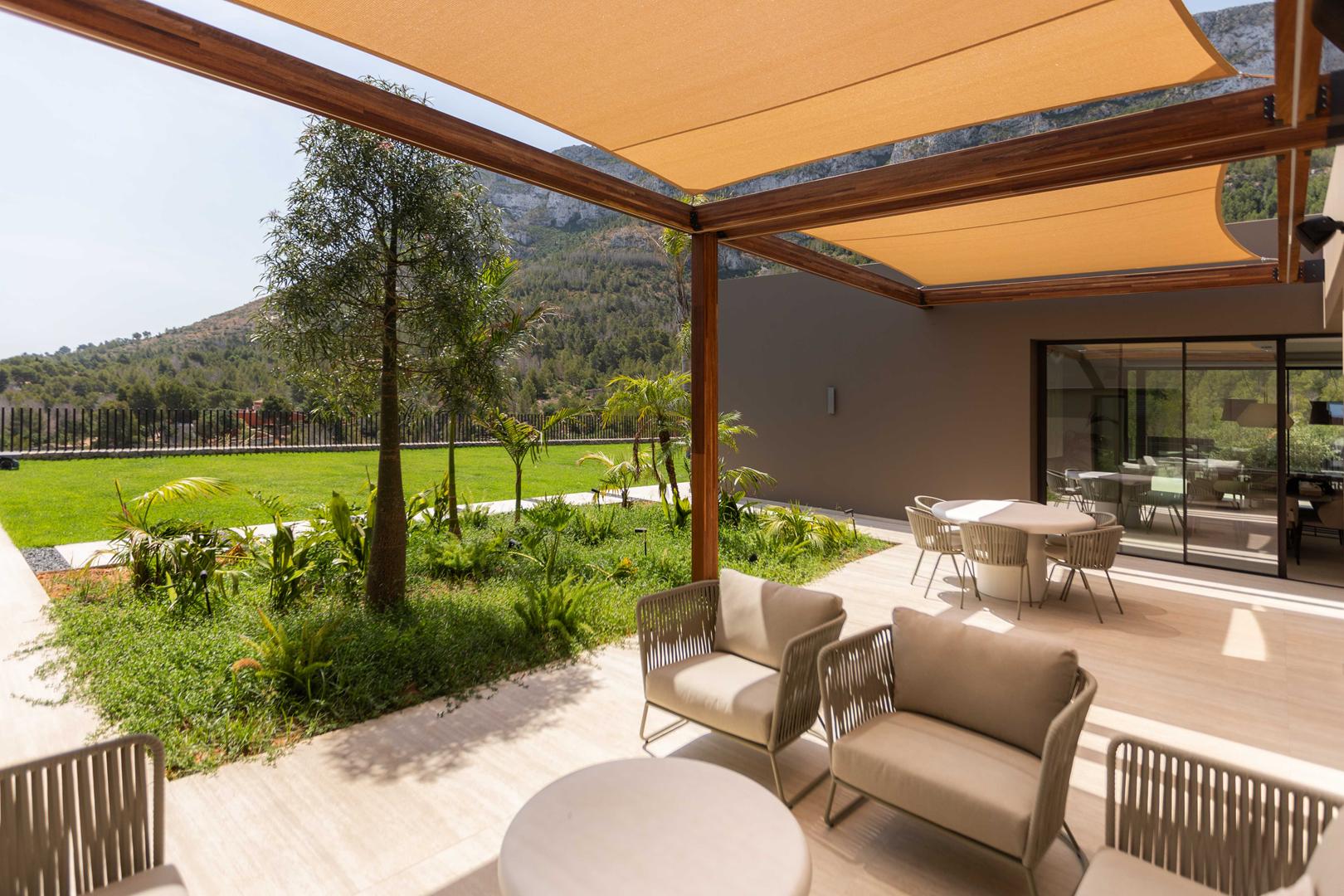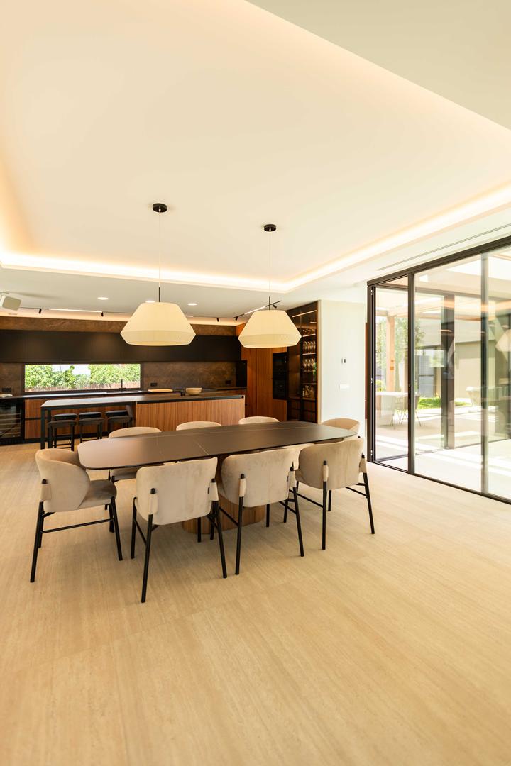 La instalación de la carpintería de gran formato fue crucial, especialmente en la ventana con apertura en esquina que accede al patio interior, requiriendo una alta precisión para asegurar la hermeticidad y el correcto funcionamiento del sistema. En el exterior, se construyó una piscina de diseño minimalista con revestimiento de gresite oscuro (o similar), logrando un contraste vibrante con el césped y los tonos neutros del pavimento de la terraza.