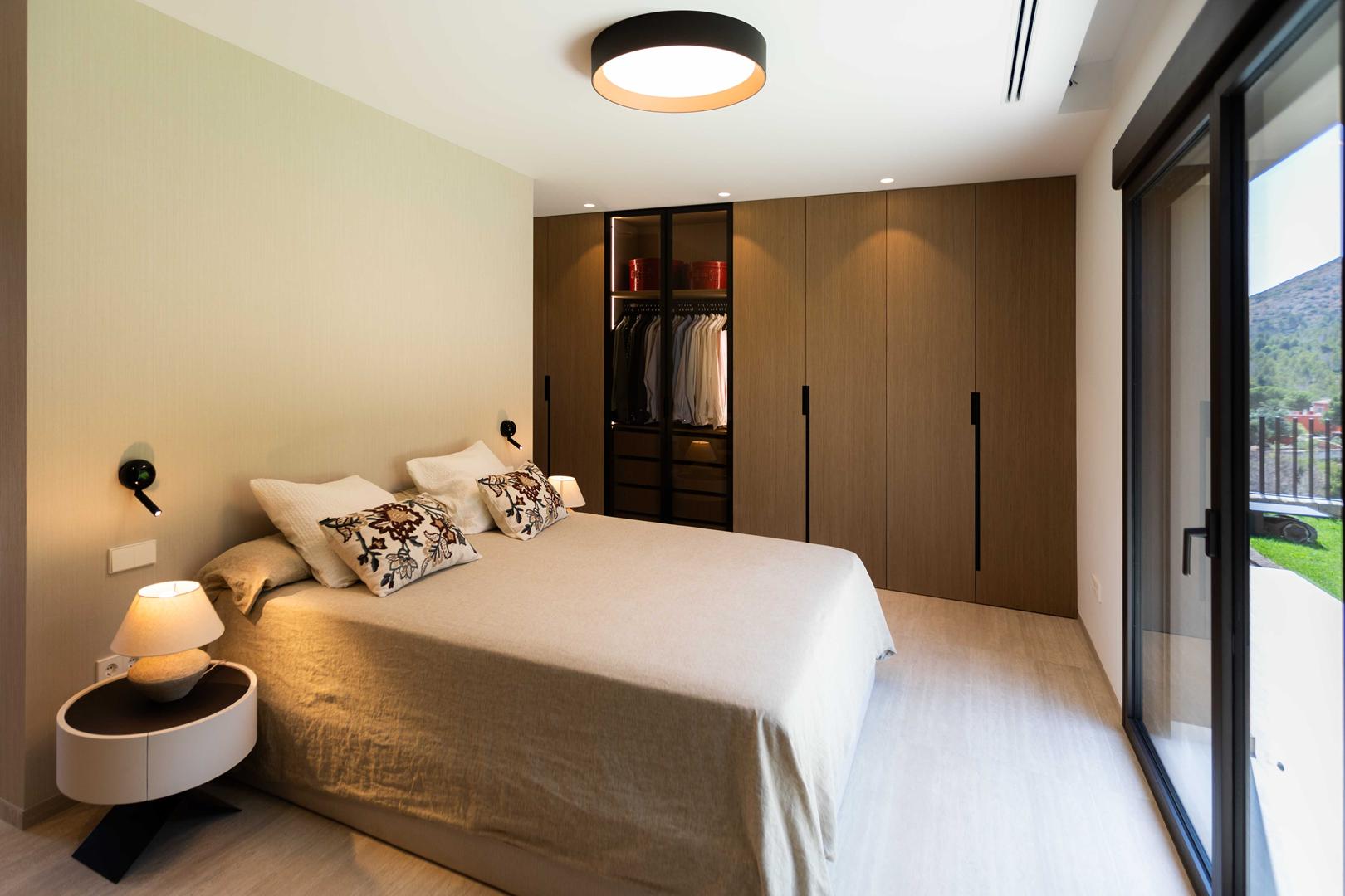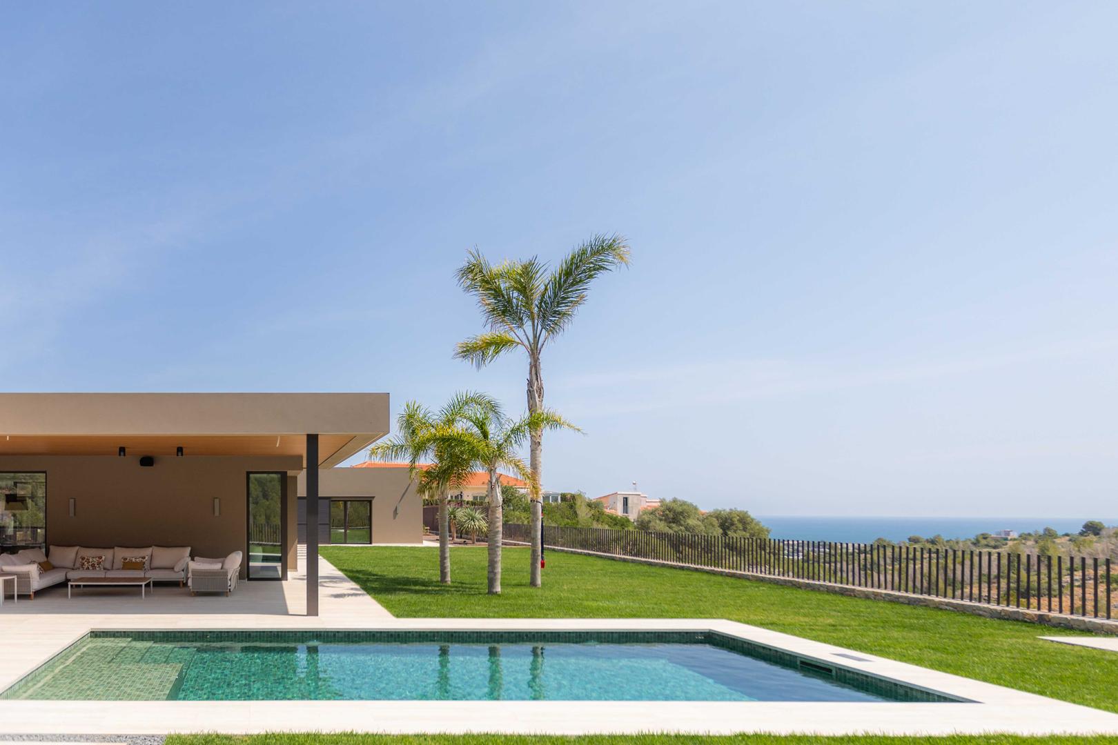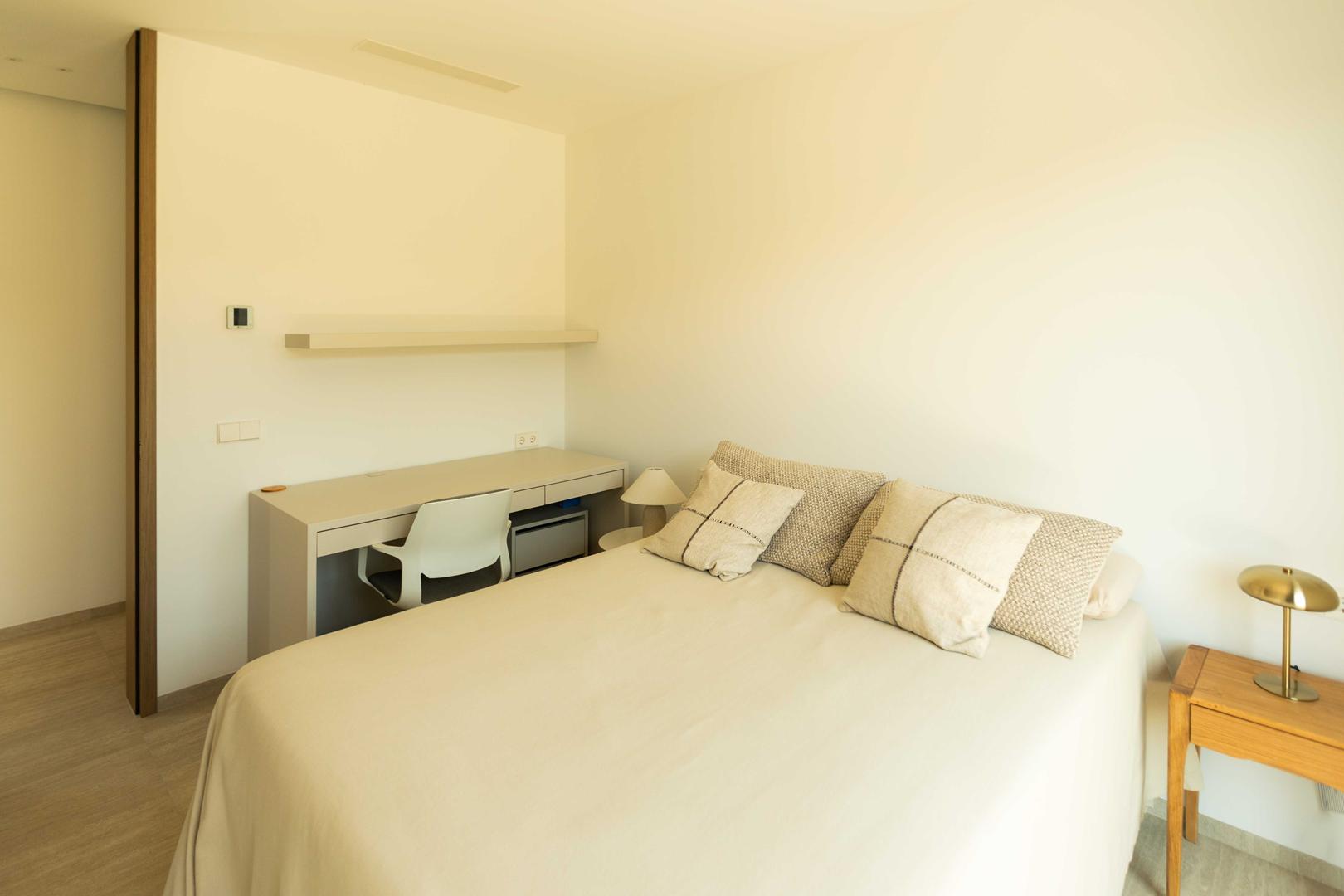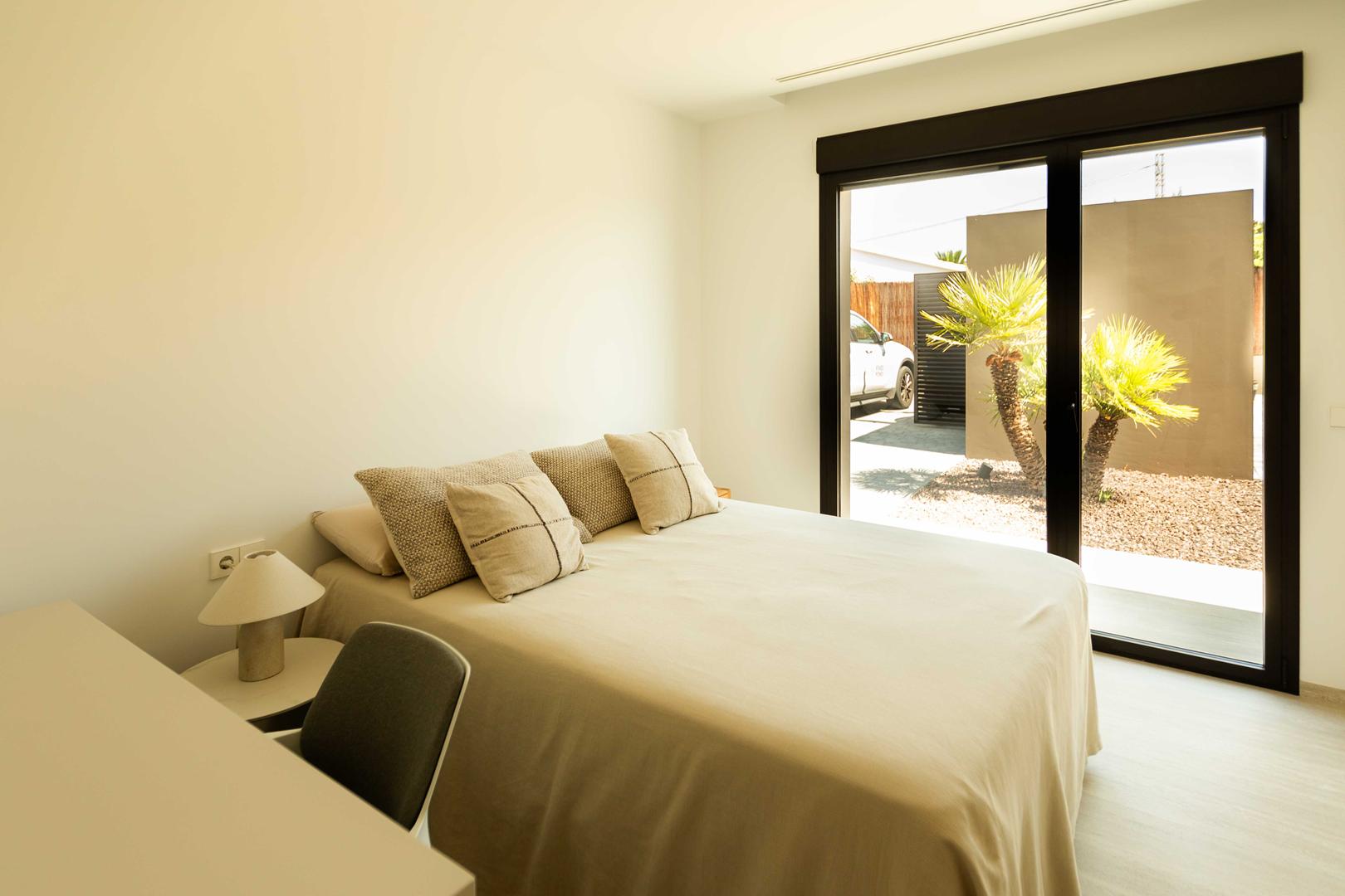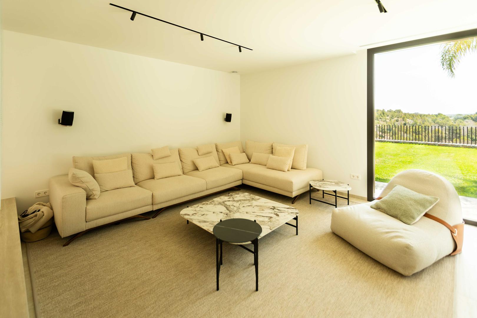 La instalación de la carpintería de gran formato fue crucial, especialmente en la ventana con apertura en esquina que accede al patio interior, requiriendo una alta precisión para asegurar la hermeticidad y el correcto funcionamiento del sistema. En el exterior, se construyó una piscina de diseño minimalista con revestimiento de gresite oscuro (o similar), logrando un contraste vibrante con el césped y los tonos neutros del pavimento de la terraza.