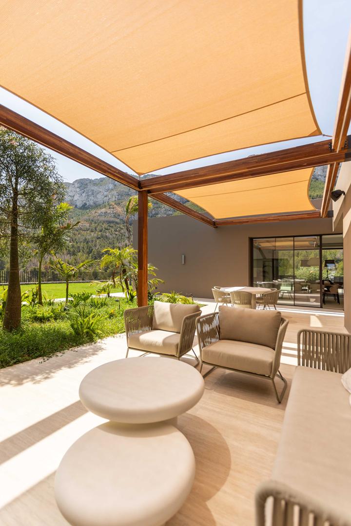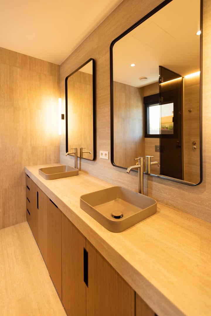 La materialidad exterior se define por la combinación de tonos tierra lisos y un imponente muro de piedra natural que ancla la vivienda al terreno. El gran porche se resolvió con una estructura de cubrimiento plano y sin pilares intermedios (o con pilares muy esbeltos) en el borde, lo que fue un reto constructivo para garantizar la limpieza visual del voladizo.